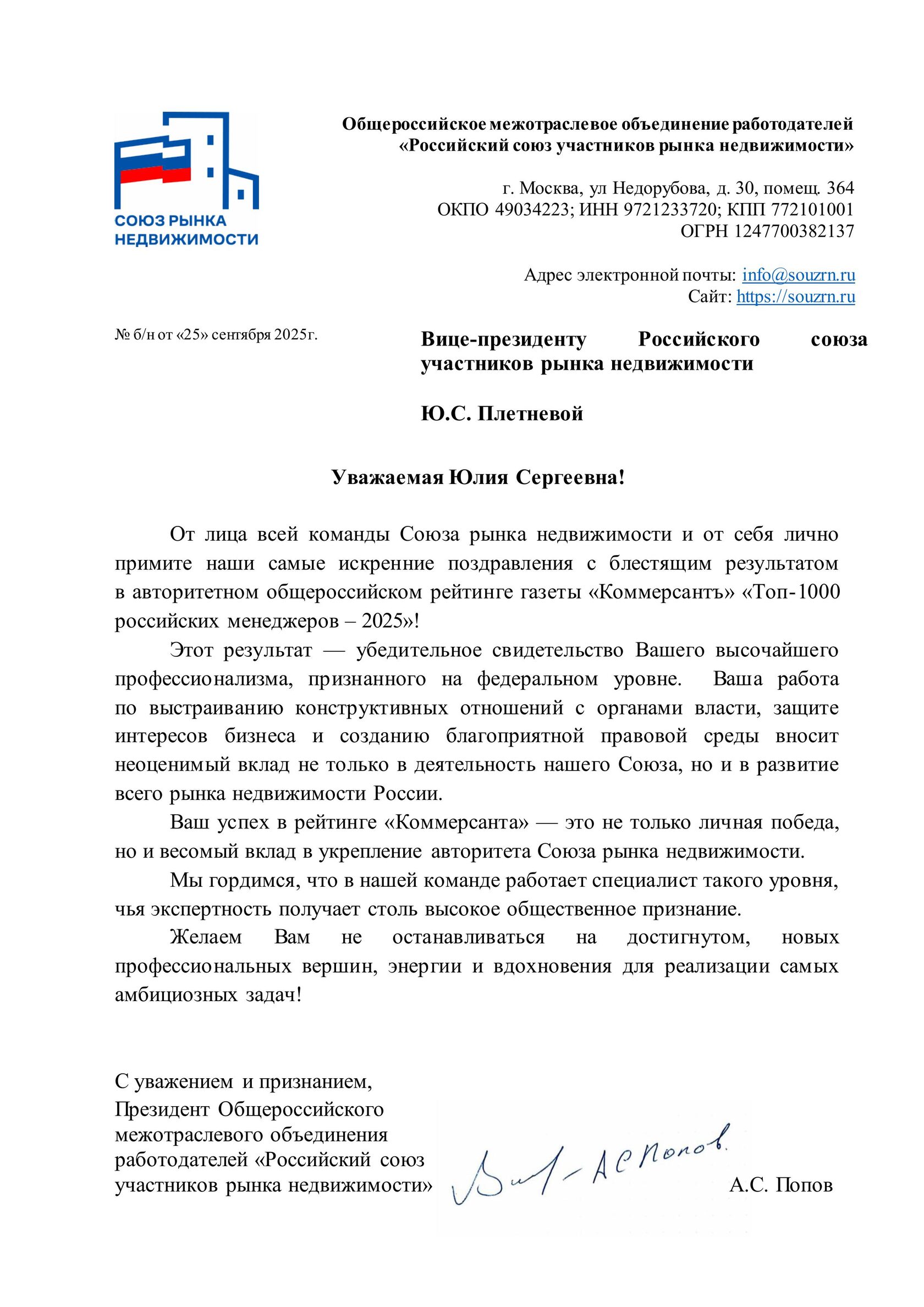 Юлия Плетнева, Вице-президент Союза рынка недвижимости, директор по работе с государственными органами группы "Плюс" вошла в число лучших GR-директоров России по версии рейтинга «Коммерсанта»!